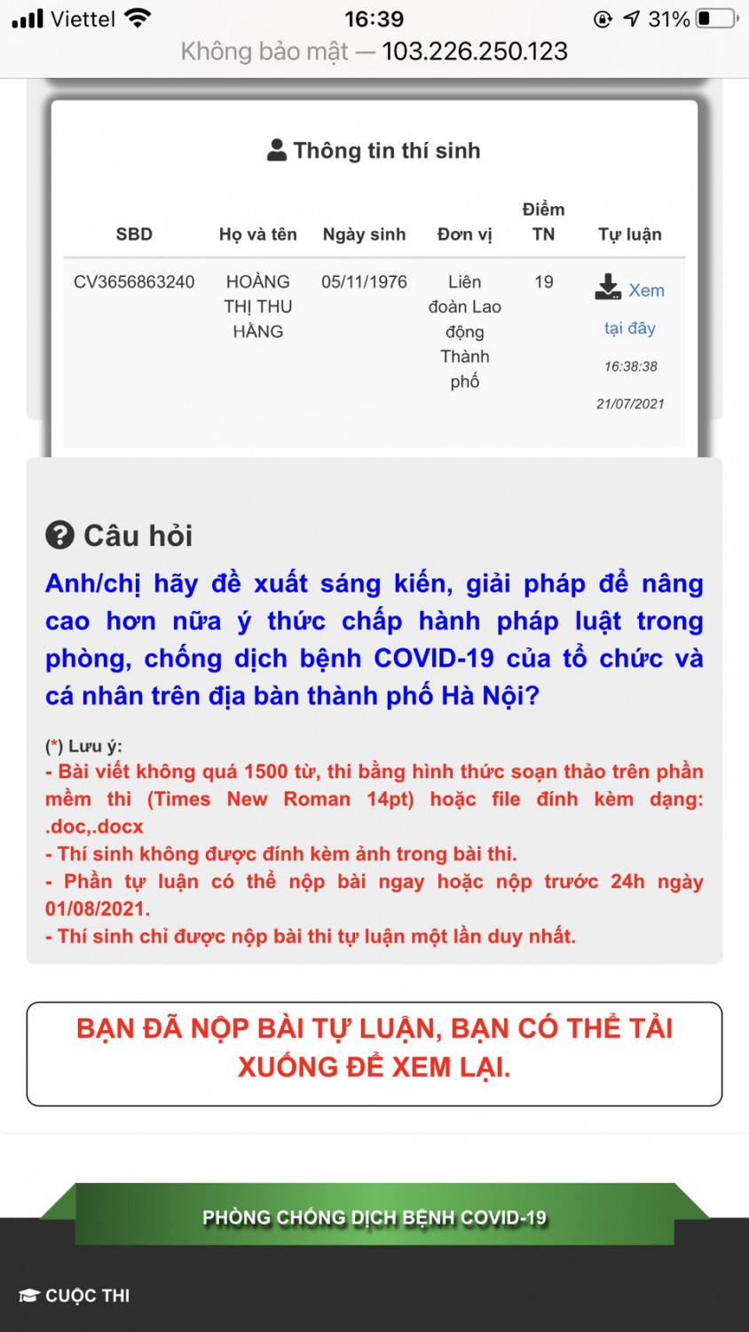 Cuộc thi được tổ chức theo hình thức thi trực tuyến tại địa chỉ website https://timhieuphapluatpccovid-19.hanoi.gov.vn và được kết nối trên Cổng giao tiếp điện tử thành phố, trang thông tin tuyên truyền, phổ biến pháp luật thành phố https://pbgdpl.hanoi.gov.vn và Báo Kinh tế và Đô thị. Thời gian tham gia dự thi trên hệ thống website của cuộc thi bắt đầu từ ngày 20/6/2021và kết thúc vào 24h ngày 01/8/2021. Đối tượng dự thi là CB,GV,NV và học sinh nhà trường từ đủ 12 tuổi trở lên. Việc triển khai cuộc thi trong tập thể CB,GV,NV được giao cho đồng chí Lê Hùng Tú - Chủ tịch công đoàn nhà trường phụ trách và việc triển khai cuộc thi trong tập thể học sinh nhà trường được giao cho đồng chí Nguyễn Thị Ly, giáo viên làm TPT Đội phụ trách.
