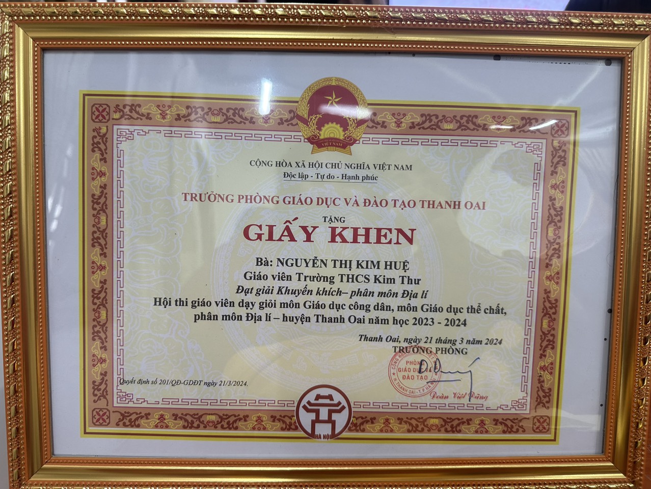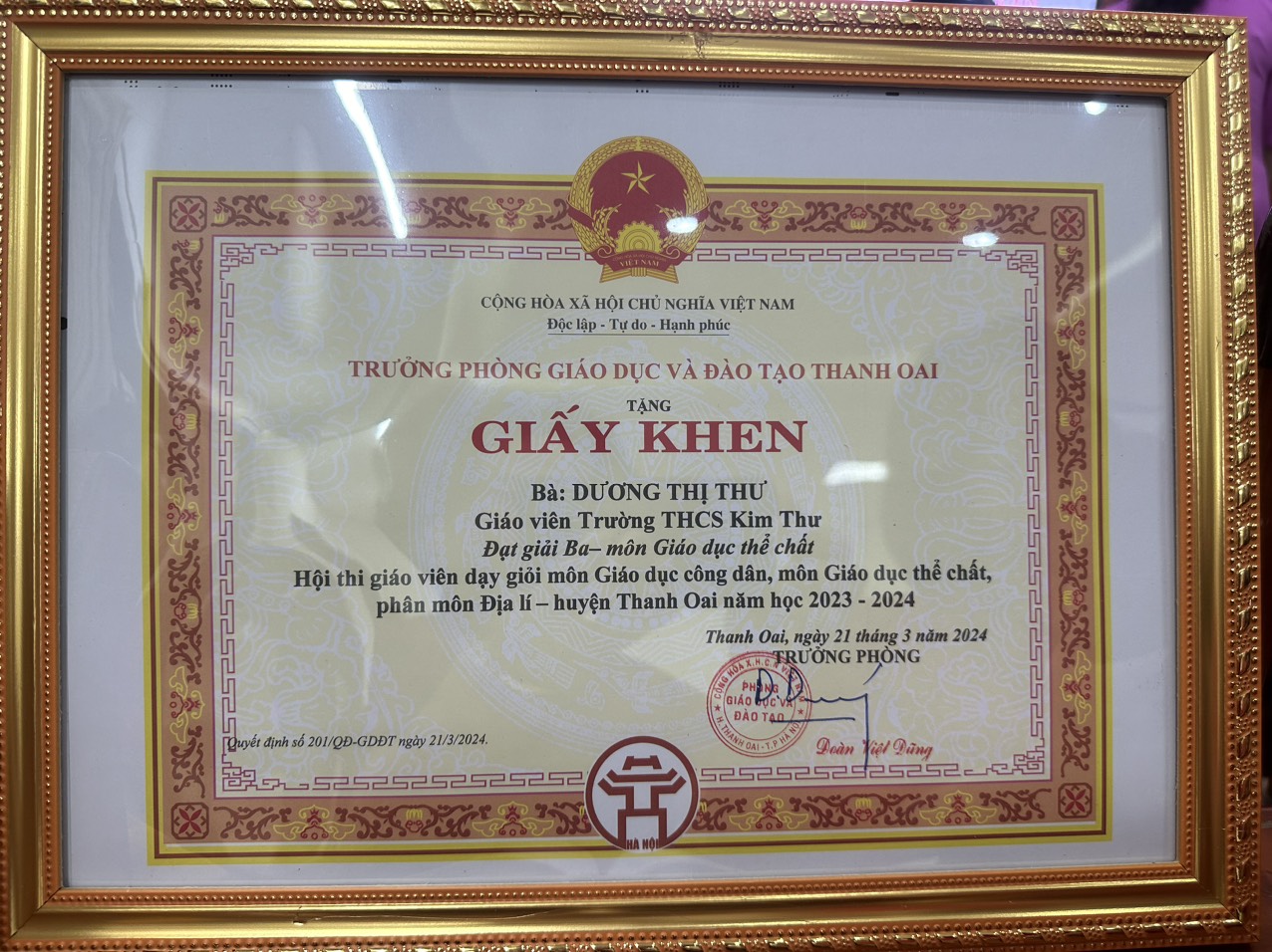 Tổng kết Hội thi giáo viên dạy giỏi môn Giáo dục công dân, Giáo dục thể chất, Địa lý (Lịch sử & Địa lý) cấp trung học cơ sở huyện Thanh Oai năm học 2023 - 2024, trường THCS Kim Thư đã đạt 3 giải/3 môn dự thi. Trong đó: